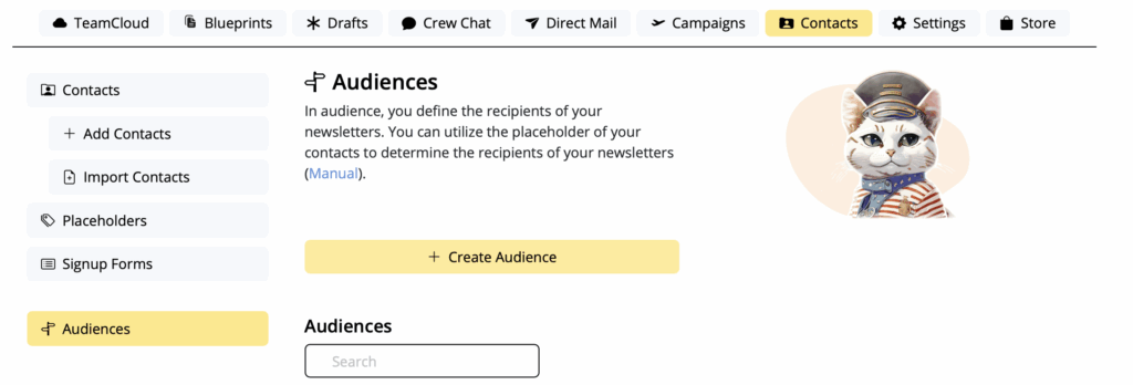 To get started, log in to your my.maildesigner365 account and go to Contacts > Audiences: